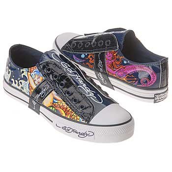 These ultra-slick Ed Hardy Denver sneakers add a powerful pop of color to casual looks. Gleaming PU-coated fabric upper in a casual slip-on sneaker style with a round toe and smooth rubber toe cap. Bold, signature Ed Hardy tattoo designs and logo add extra tough edge, faux metal lacing grommets and a hidden elasticized tongue underlay create comfortable fit. Textile lining and cushioning insole, vulcanized-look striped rubber midsole and bumper toe. Rubber traction outsole.